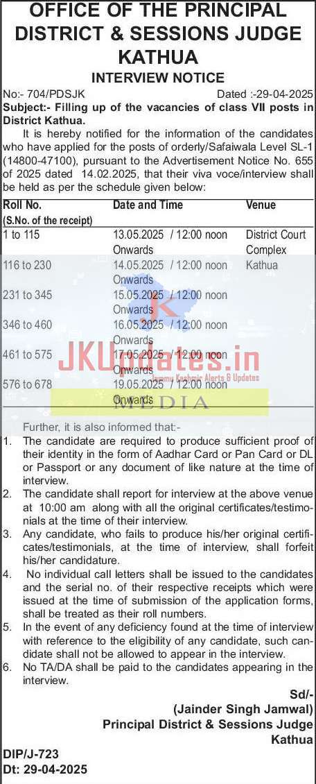 It is hereby notified for the information of the candidates who have applied for the posts of orderly/Safaiwala Level SL-1 (14800-47100), pursuant to the Advertisement Notice No. 655 of 2025 dated 14.02.2025, that their viva voce/interview shall be held as per the schedule given below :