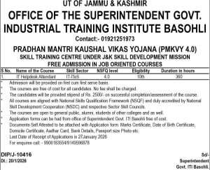 The Government Industrial Training Institute (ITI), Basohli invites applications for free skill training under Pradhan Mantri Kaushal Vikas Yojana (PMKVY 4.0).