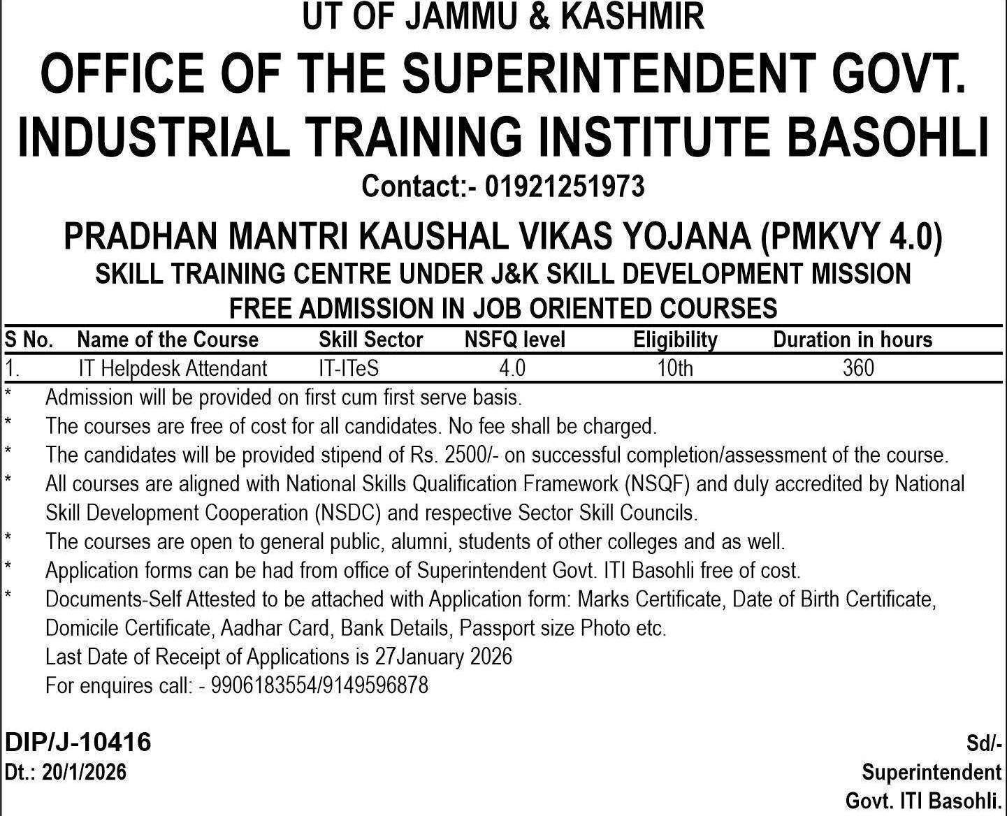 Application forms can be obtained free of cost from the Office of the Superintendent, Govt. ITI Basohli.