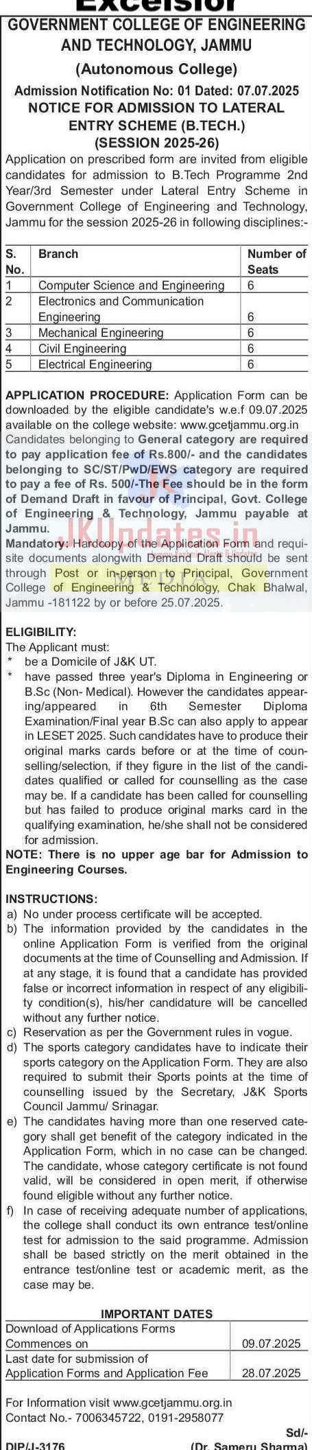 Mandatory: Hardcopy of the Application Form and requisite documents along with Demand Draft should be sent through Post or in-person to Principal, Government College of Engineering & Technology, Chak Bhalwal, Jammu -181122 by or before 25.07.2025.