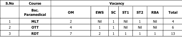 In pursuance to the State Allied and HealthCare Council, J&K Vide Notification No.:- SAHC/Gen/25/1/701-711 dated 14.10.2025, the applications through online mode i.e. Google Form Link (available on www.gmckathua.in) from the interested candidates for the Course of Bsc. Paramedical Courses (MLT, OTT, RDT) for Left over Number of Seat mentioned below in the Govt. Medical College, Kathua for the session 2025-26 are hereby invited up-to 02 November, 2025 along-with Application fee of Rs. 500/to be paid online (under S. Account No.:- 1230010200000034, IFSC:- JAKA0OLDBUS and Account Name: Principal, GMC Kathua Admission Fund),