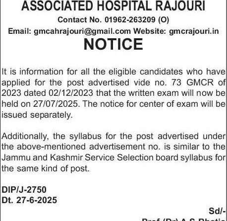 It is information for all the eligible candidates who have applied for the post advertised vide no. 73 GMCR of 2023 dated 02/12/2023 that the written exam will now be held on 27/07/2025. The notice for center of exam will be issued separately.
