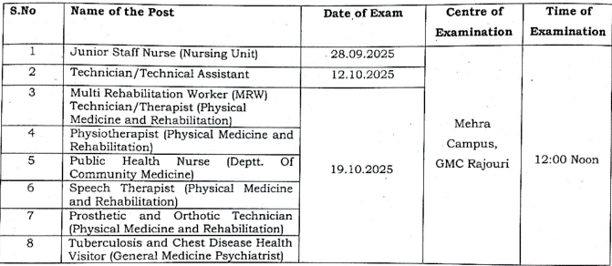 In continuation to this office Notice No: GMCR/2025-26/3045-49 dated 22.07.2025, it is hereby notified for the information of all the candidates that the written examination for the posts advertised vide Notification No. 73 GMCR of 2023 dated 02.12.2023, which was previously postponed, shall now be conducted as per the schedule given below: