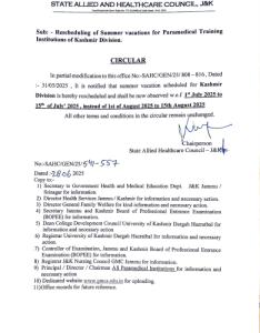 It is notified that summer vacation scheduled for Kashmir Division is hereby rescheduled and shall be now observed w.e.f 1st July 2025 to 15th of July’ 2025, instead of 1st of August 2025 to 15th August 2025
