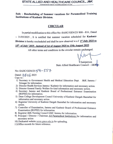 Rescheduling of Summer vacations for Paramedical Training Institutions of Kashmir Division