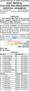 Written MCQ test for the post of Senior Resident, Department of ENT and Paediatrics at GMC, Udhampur.