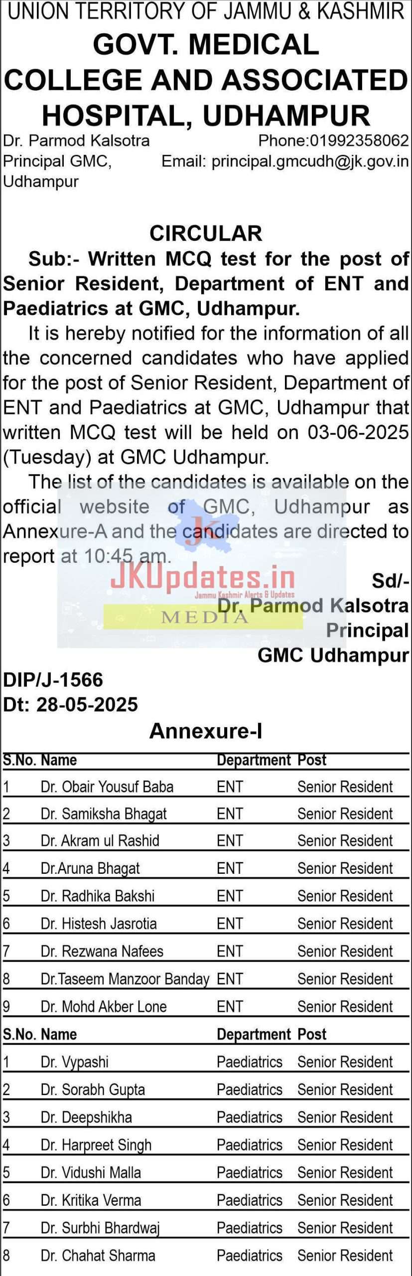 It is hereby notified for the information of all the concerned candidates who have applied for the post of Senior Resident, Department of ENT and Paediatrics at GMC, Udhampur that written MCQ test will be held on 03-06-2025 (Tuesday) at GMC Udhampur.