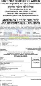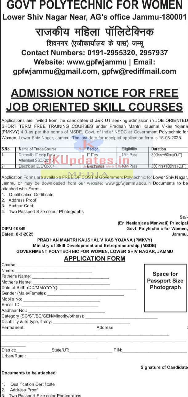 Applications are invited from the candidates of J&K UT seeking admission in JOB ORIENTED SHORT TERM FREE TRAINING COURSES under Pradhan Mantri Kaushal Vikas Yojana (PMKVY) 4.0 as per the norms of MSDE, Govt, of India/ NSDC at Government Polytechnic for Women, Lower Shiv Nagar, Jammu. The last date for receipt of application form is 15-03-2025.