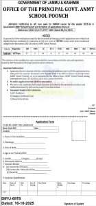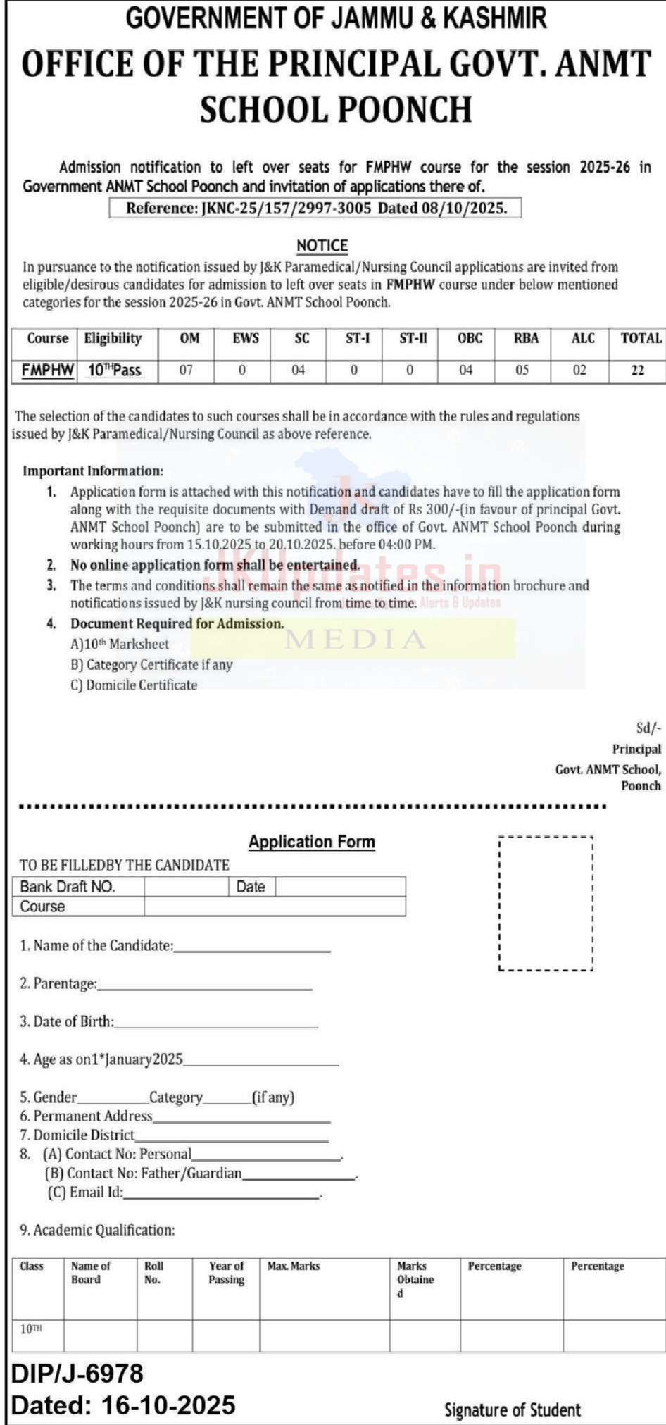 Application form is attached with this notification and candidates have to fill the application form along with the requisite documents with Demand draft of Rs 300/- (in favour of Principal Govt. ANMT School Poonch) are to be submitted in the office of Govt. ANMT School Poonch during working hours from 15.10.2025 to 20.10.2025 before 04:00 PM.