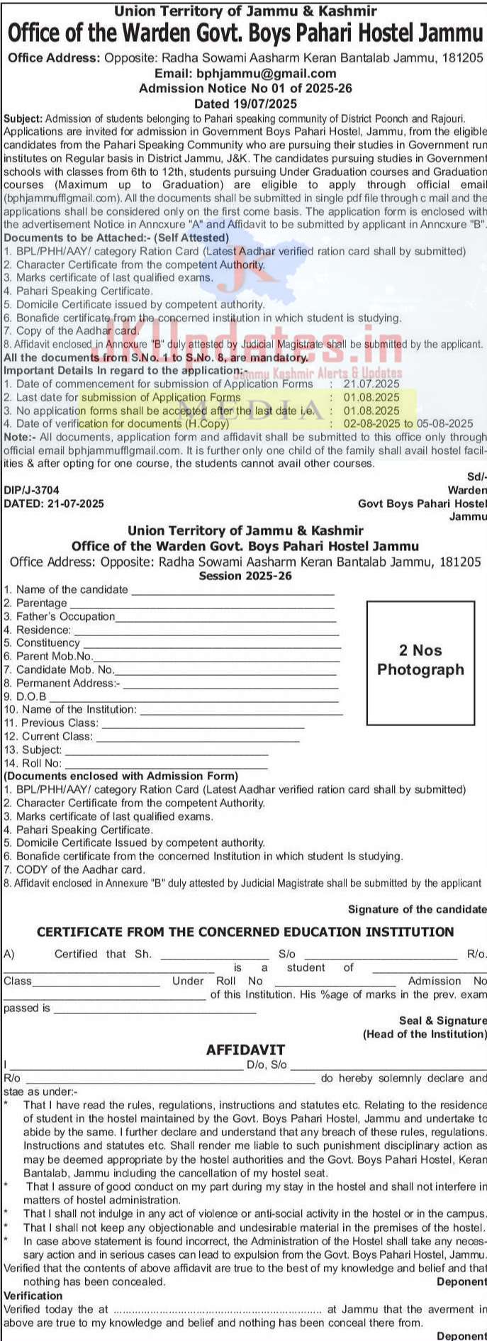 Applications are invited for admission in Government Boys Pahari Hostel, Jammu, from the eligible candidates from the Pahari Speaking Community who are pursuing their studies in Government run institutes on Regular basis in District Jammu, J&K. The candidates pursuing studies in Government schools with classes from 6th to 12th, students pursuing Under Graduation courses and Graduation courses (Maximum up to Graduation) are eligible to apply through official email (bphjammufflgmail.com). All the documents shall be submitted in single pdf file through c mail and the applications shall be considered only on the first come basis. The application form is enclosed with the advertisement Notice in Annexure “A” and Affidavit to be submitted by applicant in Annexure “B”.