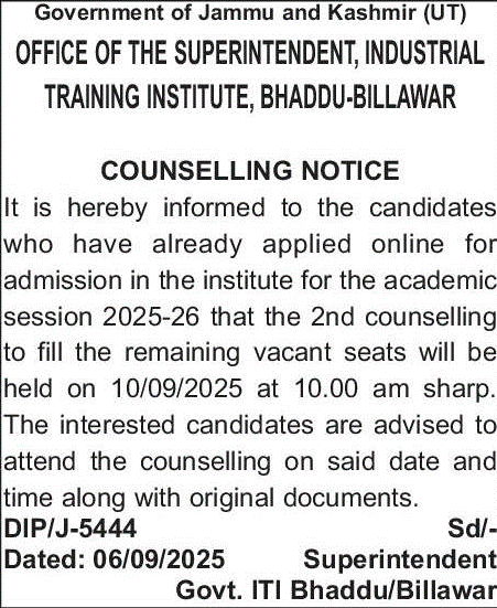 It is hereby informed to the candidates who have already applied online for admission in the institute for the academic session 2025-26 that the 2nd counselling to fill the remaining vacant seats will be held on 10/09/2025 at 10.00 am sharp.