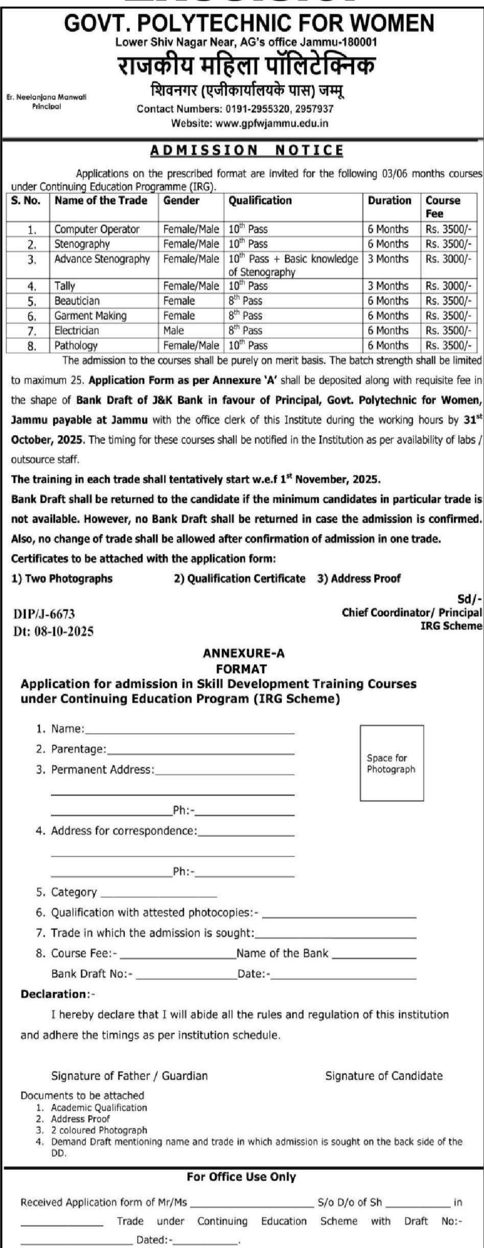 Application Form as per Annexure ‘A’ shall be deposited along with the requisite fee in the shape of Bank Draft of J&K Bank in favour of Principal, Govt. Polytechnic for Women, Jammu, payable at Jammu, with the office clerk of this Institute during working hours by 31st October, 2025.