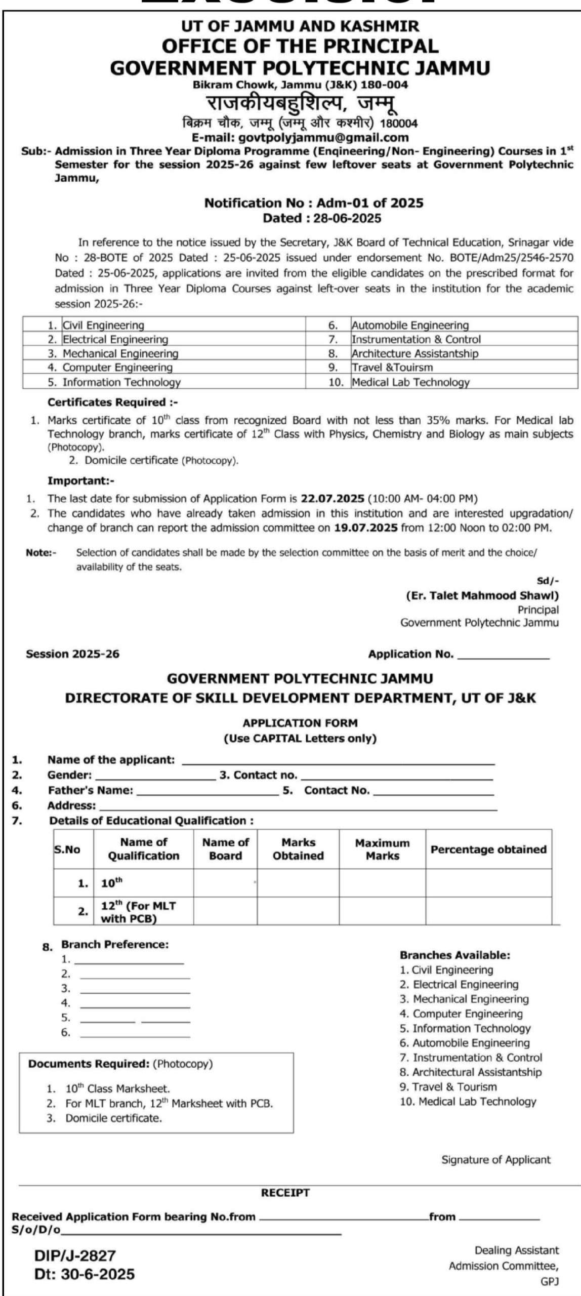 In reference to the notice issued by the Secretary, J&K Board of Technical Education, Srinagar vide No: 28-BOTE of 2025 Dated: 25-06-2025 issued under endorsement No. BOTE/Adm25/2546-2570 Dated: 25-06-2025, applications are invited from eligible candidates on the prescribed format for admission in Three Year Diploma Courses against left-over seats in the institution for the academic session 2025-26: