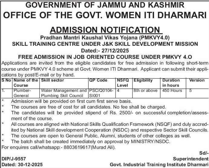 Applications are invited from the eligible candidates for free admission in following short-term course under PMKVY 4.0 scheme at Govt. Women ITI Dharmari.