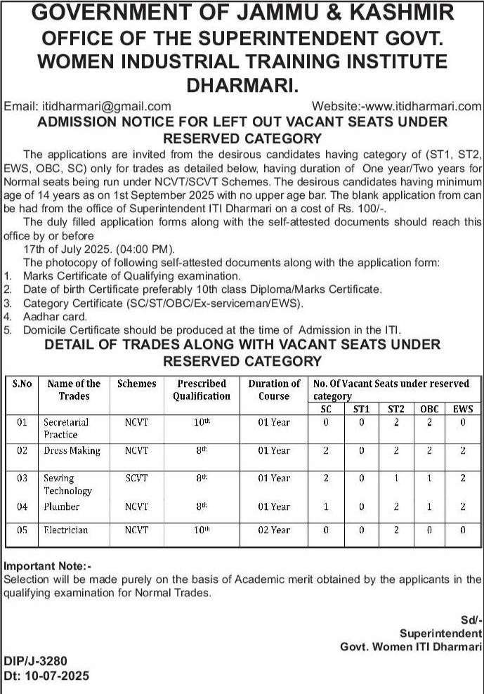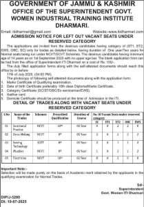 The applications are invited from the desirous candidates having category of (ST1, ST2, EWS, OBC, SC) only for trades as detailed below, having duration of One year/Two years for Normal seats being run under NCVT/SCVT Schemes. The desirous candidates having minimum age of 14 years as on 1st September 2025 with no upper age bar.