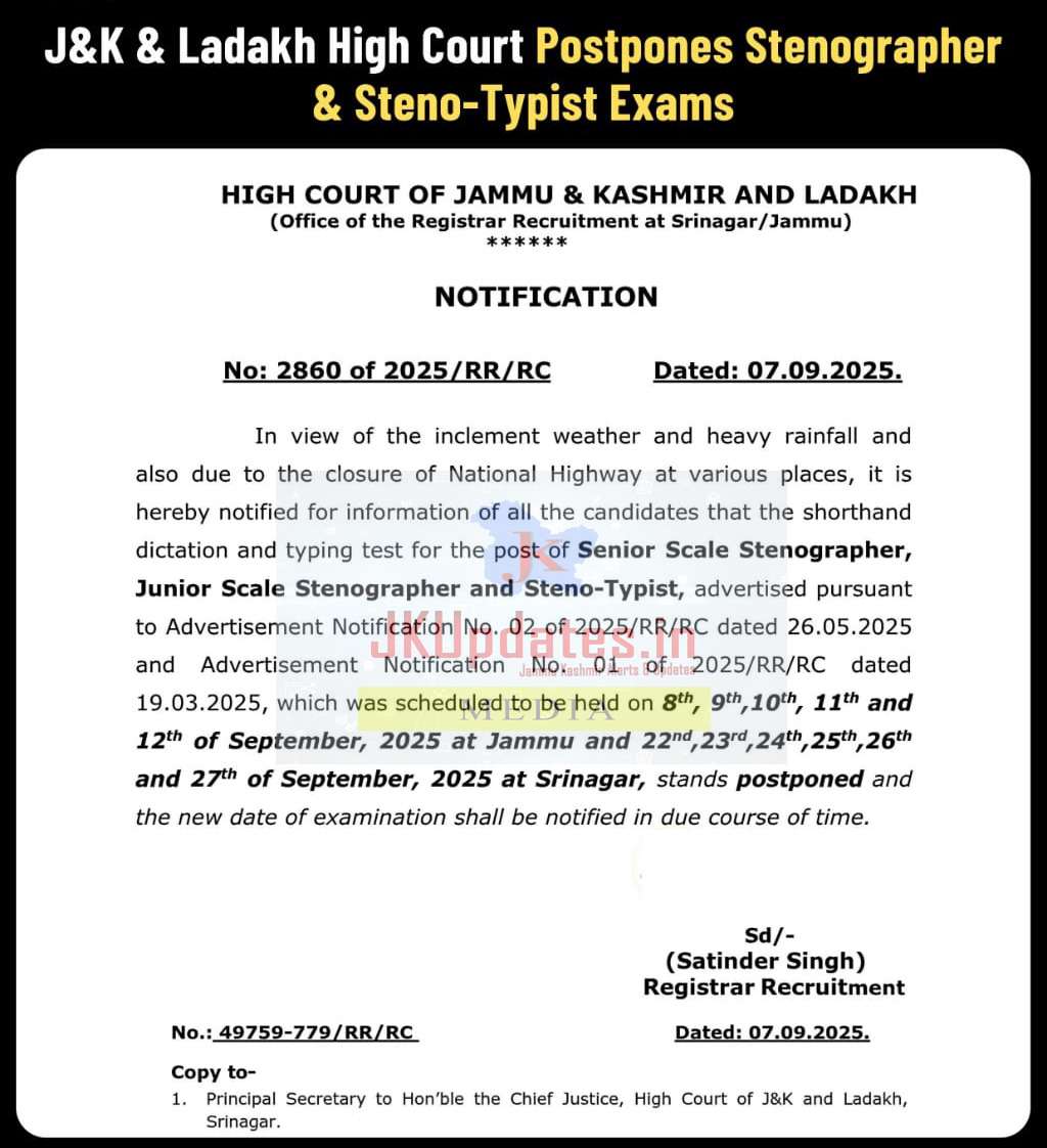 In view of the inclement weather and heavy rainfall and also due to the closure of National Highway at various places, it is hereby notified for information of all the candidates that the shorthand dictation and typing test for the post of Senior Scale Stenographer, Junior Scale Stenographer and Steno-Typist, advertised pursuant to Advertisement Notification No. 02 of 2025/RR/RC dated 26.05.2025 and Advertisement Notification No. 01 of 2025/RR/RC dated 19.03.2025, which was scheduled to be held on 8th, 9th, 10th, 11th and 12th of September, 2025 at Jammu and 22nd, 23rd, 24th, 25th, 26th and 27th of September, 2025 at Srinagar, stands postponed and the new date of examination shall be notified in due course of time.