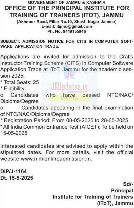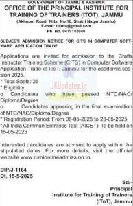 Applications are invited for admission to the Crafts Instructor Training Scheme (CITS) in Computer Software Application Trade at IToT, Jammu for the academic session 2025.