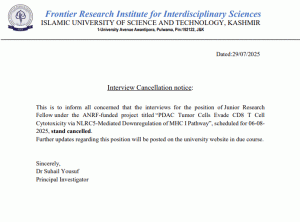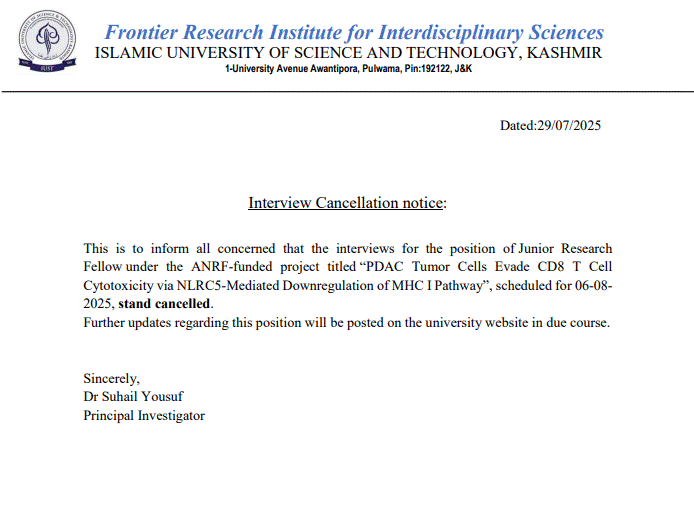 IUST: Cancellation of Interview for the Post of JRF in FRISS