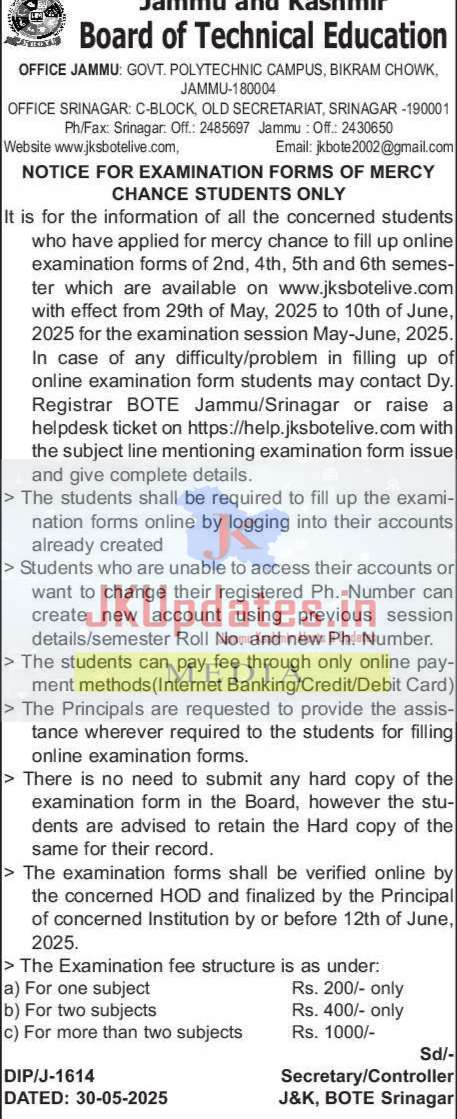 It is for the information of all the concerned students who have applied for mercy chance to fill up online examination forms of 2nd, 4th, 5th and 6th semester which are available on www.jksbotelive.com with effect from 29th of May, 2025 to 10th of June, 2025 for the examination session May-June, 2025. In case of any difficulty/problem in filling up of online examination form students may contact Dy. Registrar BOTE Jammu/Srinagar or raise a helpdesk ticket on https://help.jksbotelive.com with the subject line mentioning examination form issue and give complete details.