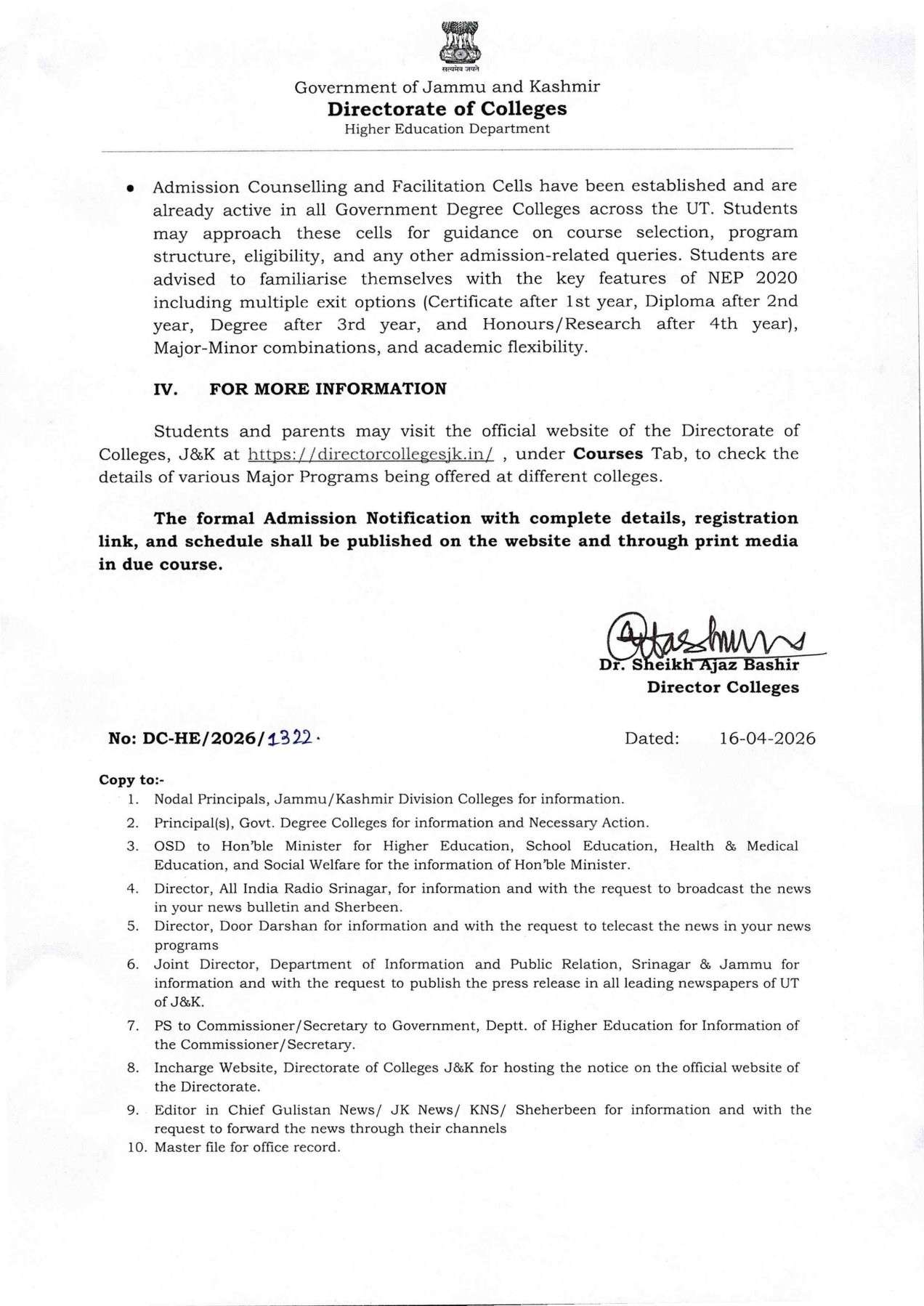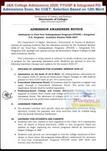 The Directorate of Colleges, Higher Education Department J&K has released an Admission Awareness Notice dated 16 April 2026, notifying students about the forthcoming admission process for Four-Year Undergraduate Programmes (FYUGP) and Integrated Postgraduate Programmes for the Academic Session 2026–27. According to the notice, admissions in all Government Degree Colleges across Jammu & Kashmir will commence shortly, with several reforms being implemented in line with the National Education Policy (NEP) 2020.