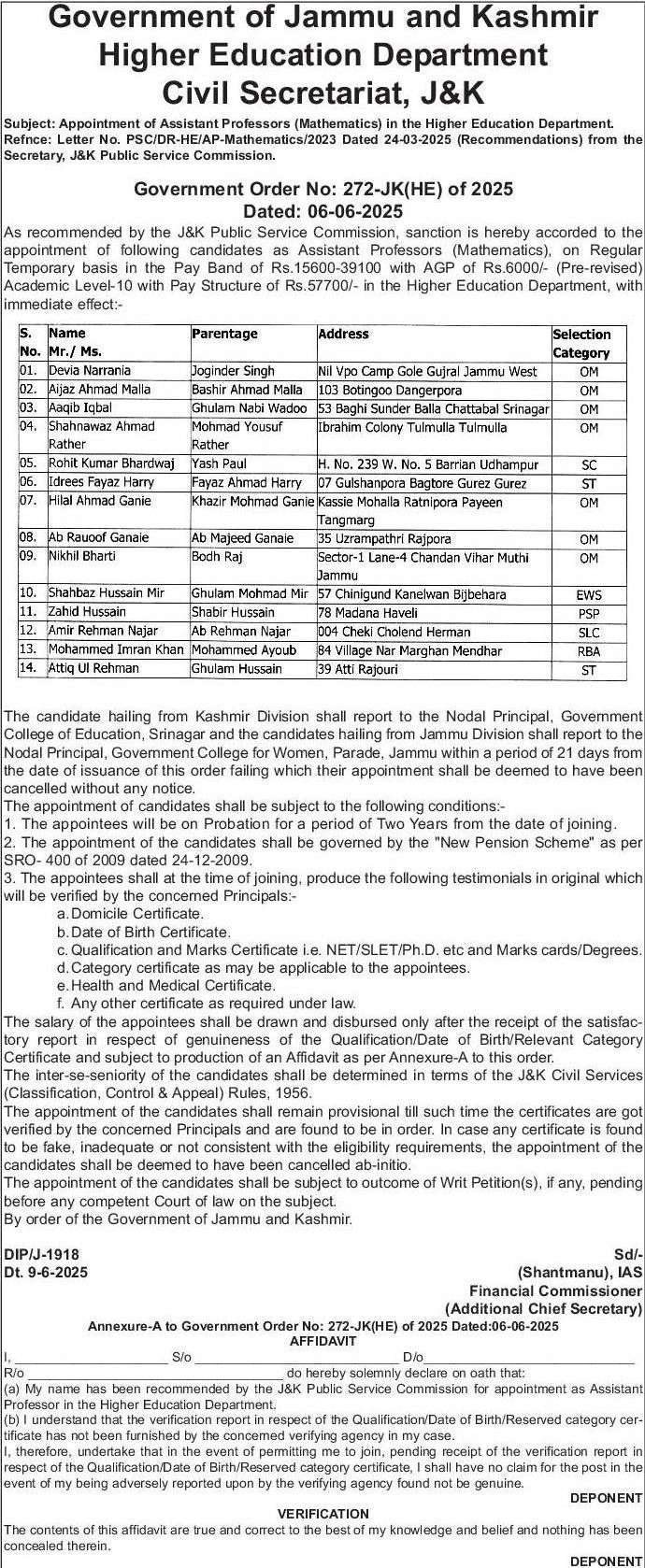 As recommended by the J&K Public Service Commission, sanction is hereby accorded to the appointment of following candidates as Assistant Professors (Mathematics), on Regular Temporary basis in the Pay Band of Rs.15600-39100 with AGP of Rs.6000/- (Pre-revised) Academic Level-10 with Pay Structure of Rs.57700/- in the Higher Education Department, with immediate effect:-