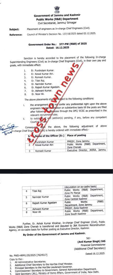 Jammu and Kashmir Government ordered placement as Chief Engineers and their postings