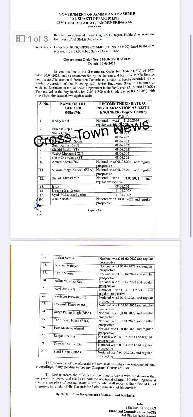 Jammu and Kashmir Government ordered regular promotion as Assistant Engineers.