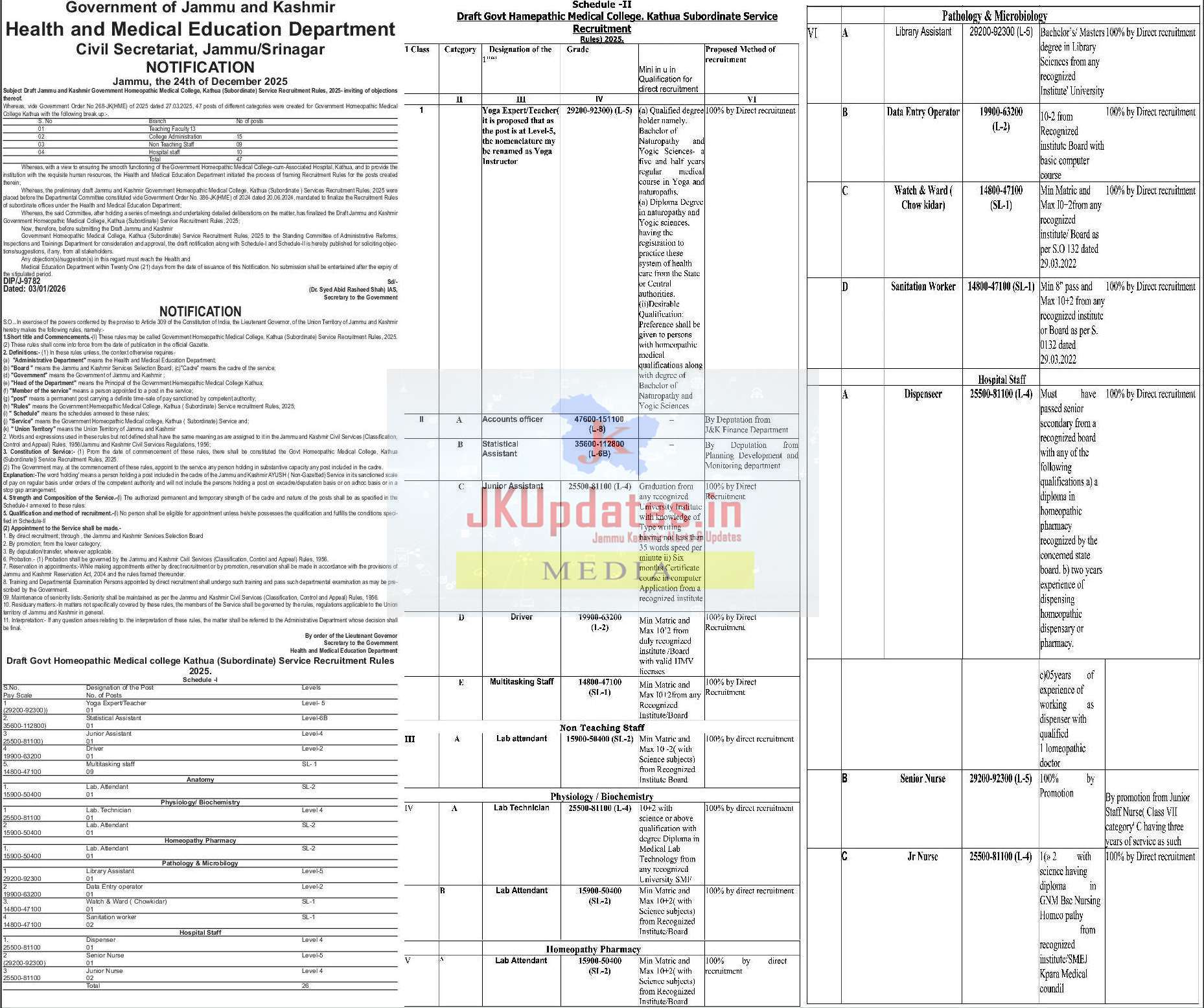 Draft Govt Homeopathic Medical college Kathua (Subordinate) Service Recruitment Rules 2025.