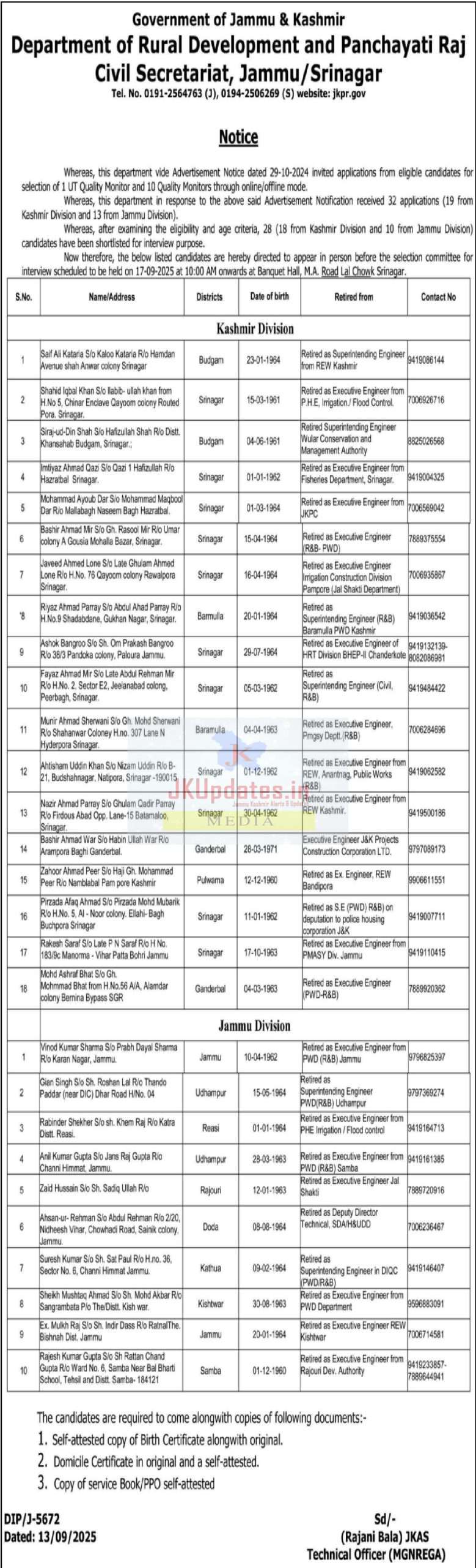 Now therefore, the below listed candidates are hereby directed to appear in person before the selection committee for interview scheduled to be held on 17-09-2025 at 10:00 AM onwards at Banquet Hall, M.A. Road Lal Chowk Srinagar.