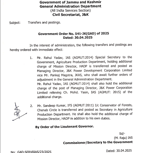 JKGAD ordered transfers and postings of IAS , IFS Officers.