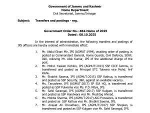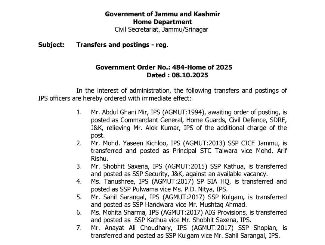 Mr. Shobhit Saxena, IPS (AGMUT:2015) SSP Kathua, is transferred and posted as SSP Security, J&K, against an available vacancy.