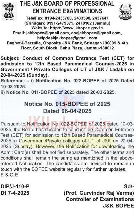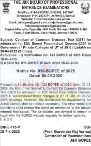 Pursuant to Notification No. 022-BOPEE of 2025 dated 10-03-2025, the Board has decided to conduct the Common Entrance Test (CET) for admission to 12th Based Paramedical Courses-2025 in Government/Private colleges of UT of J&K on 20-04-2025 (Sunday). However, the Notification for downloading the Admit Card(s) shall be notified separately. The other terms and conditions shall remain the same as mentioned in the above-referred Notification. The candidates are advised to remain in touch with the BOPEE website regularly for further updates.