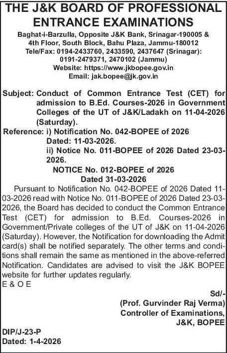 Pursuant to Notification No. 042-BOPEE of 2026 Dated 11-03-2026 read with Notice No. 011-BOPEE of 2026 Dated 23-03-2026, the Board has decided to conduct the Common Entrance Test (CET) for admission to B.Ed. Courses-2026 in Government/Private colleges of the UT of J&K on 11-04-2026 (Saturday).