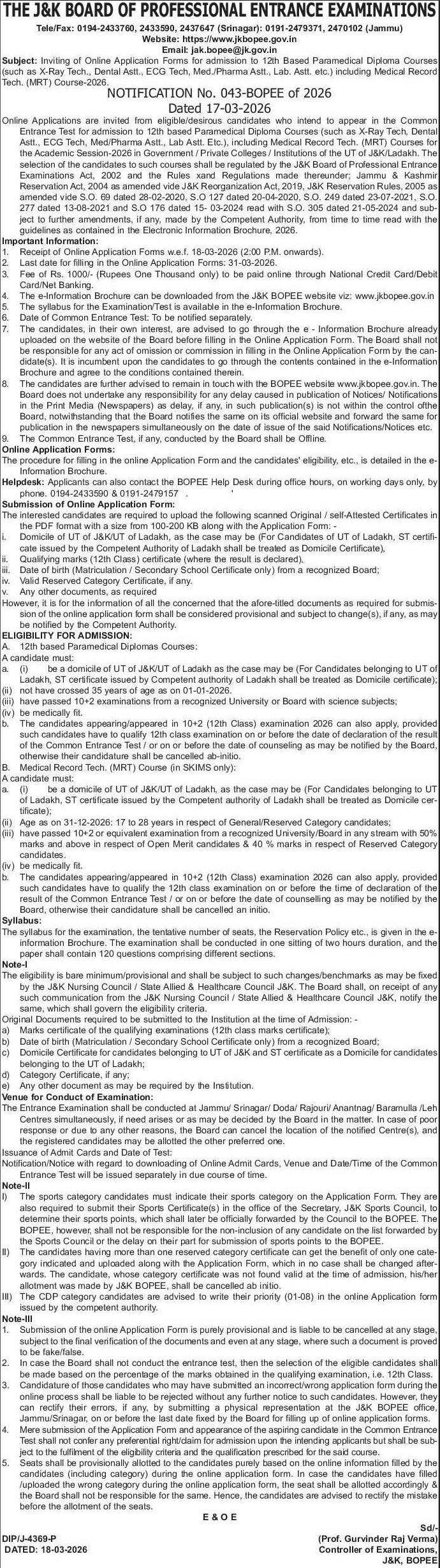 Online Applications are invited from eligible/desirous candidates who intend to appear in the Common Entrance Test for admission to 12th based Paramedical Diploma Courses (such as X-Ray Tech, Dental Astt., ECG Tech, Med/Pharma Astt., Lab Astt. Etc.), including Medical Record Tech. (MRT) Courses for the Academic Session-2026 in Government / Private Colleges / Institutions of the UT of J&K/Ladakh. The selection of the candidates to such courses shall be regulated by the J&K Board of Professional Entrance Examinations Act, 2002 and the Rules xand Regulations made thereunder; Jammu & Kashmir Reservation Act, 2004 as amended vide J&K Reorganization Act, 2019, J&K Reservation Rules, 2005 as amended vide S.O. 69 dated 28-02-2020, S.O 127 dated 20-04-2020, S.O. 249 dated 23-07-2021, S.O. 277 dated 13-08-2021 and S.O 176 dated 15- 03-2024 read with S.O. 305 dated 21-05-2024 and subject to further amendments, if any, made by the Competent Authority, from time to time read with the guidelines as contained in the Electronic Information Brochure, 2026.