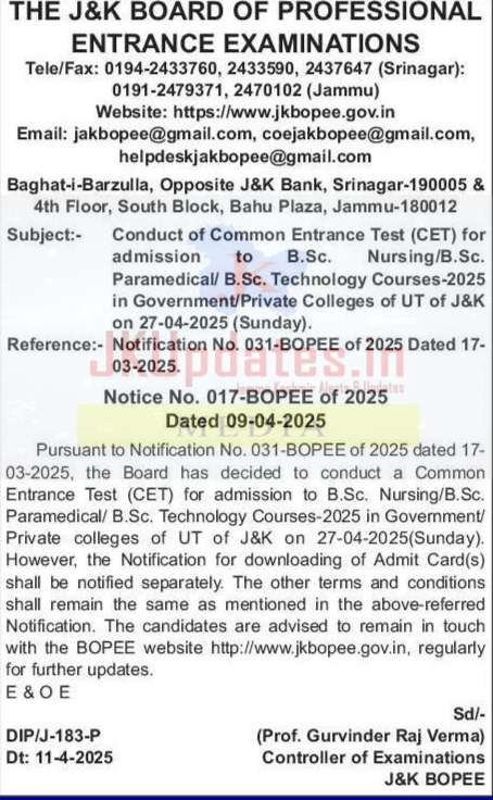 Pursuant to Notification No. 031-BOPEE of 2025 dated 17-03-2025, the Board has decided to conduct a Common Entrance Test (CET) for admission to B.Sc. Nursing/B.Sc. Paramedical/ B.Sc. Technology Courses-2025 in Government/ Private colleges of UT of J&K on 27-04-2025(Sunday). However, the Notification for downloading of Admit Card(s) shall be notified separately.