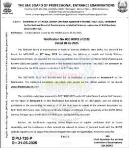 Candidates of UT of J&K /Ladakh who have appeared in the NEET MDS-2025, conducted by the National Board of Examinations in Medical Sciences βIssuance of Roll Number-wise list thereof.