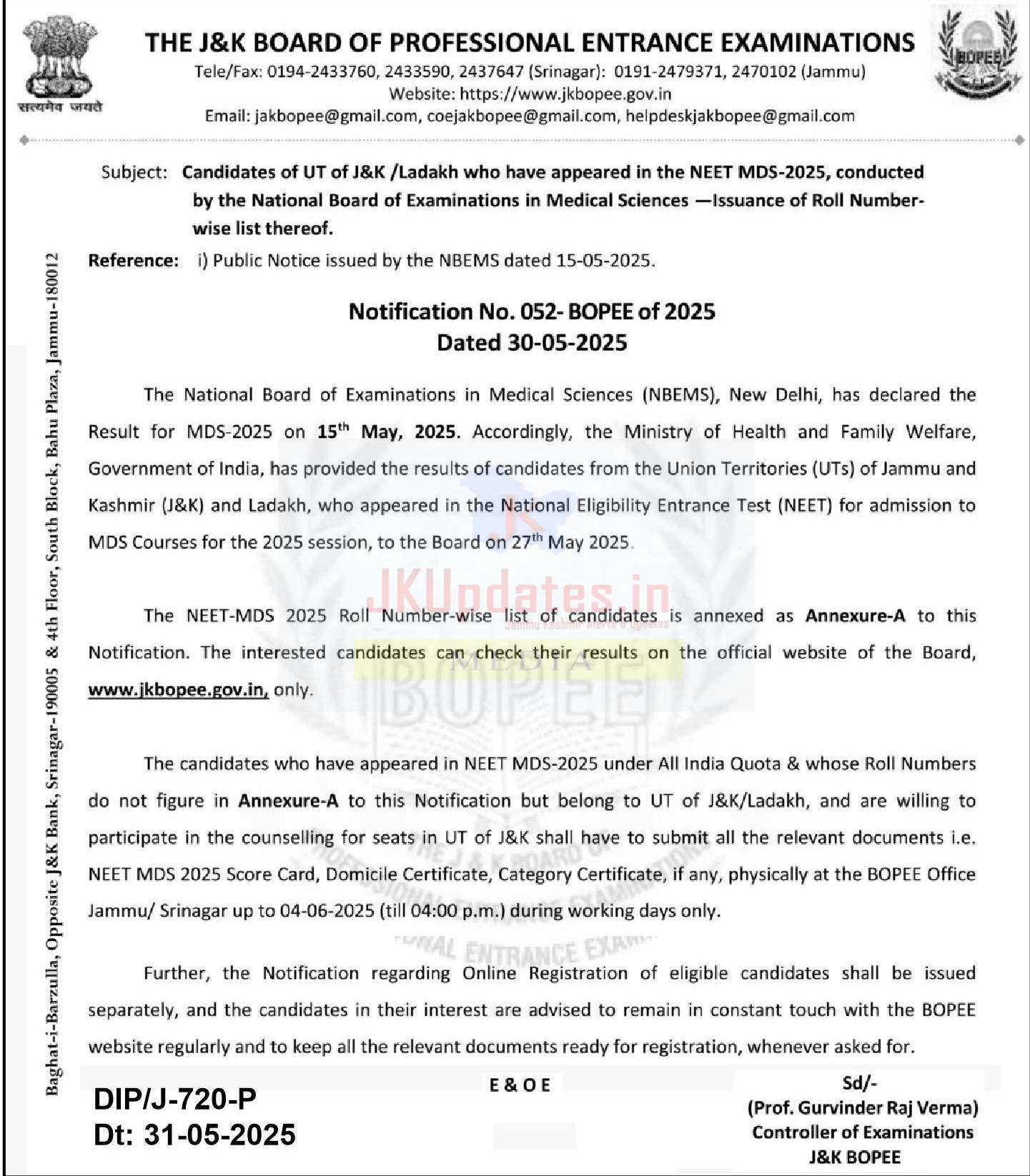 The candidates who have appeared in NEET MDS-2025 under All India Quota & whose Roll Numbers do not figure in Annexure-A to this Notification but belong to UT of J&K/Ladakh, and are willing to participate in the counselling for seats in UT of J&K shall have to submit all the relevant documents i.e. NEET MDS 2025 Score Card, Domicile Certificate, Category Certificate, if any, physically at the BOPEE Office Jammu/ Srinagar up to 04-06-2025 (till 04:00 p.m.) during working days only.