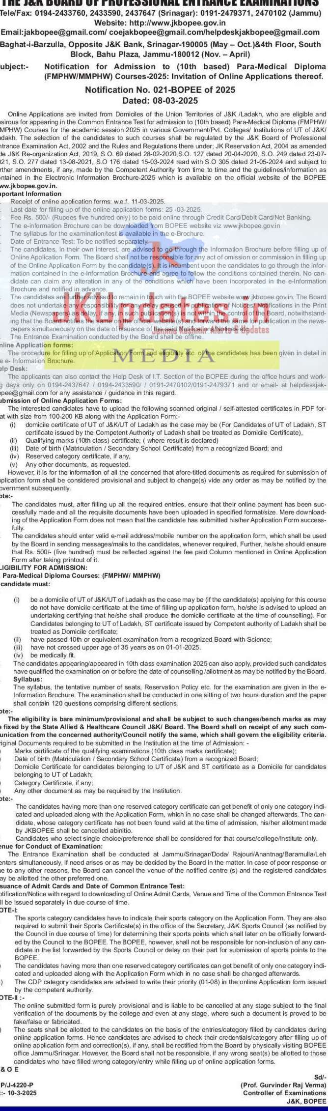 Online Applications are invited from Domiciles of the Union Territories of J&K /Ladakh, who are eligible and desirous for appearing in the Common Entrance Test for admission to (10th based) Para-Medical Diploma (FMPHW/ MMPHW) Courses for the academic session 2025 in various Government/Pvt. Colleges/ Institutions of UT of J&K/ Ladakh. The selection of the candidates to such courses shall be regulated by the J&K Board of Professional Entrance Examination Act, 2002 and the Rules and Regulations there under; JK Reservation Act, 2004 as amended vide J&K Re-organization Act, 2019, S.O. 69 dated 28-02-2020,S.O. 127 dated 20-04-2020, S.O. 249 dated 23-07-2021, S.O. 277 dated 13-08-2021, S.O 176 dated 15-03-2024 read with S.O 305 dated 21-05-2024 and subject to further amendments, if any, made by the Competent Authority from time to time and the guidelines/information as contained in the Electronic Information Brochure-2025 which is available on the official website of the BOPEEÂ www.jkbopee.gov.in.