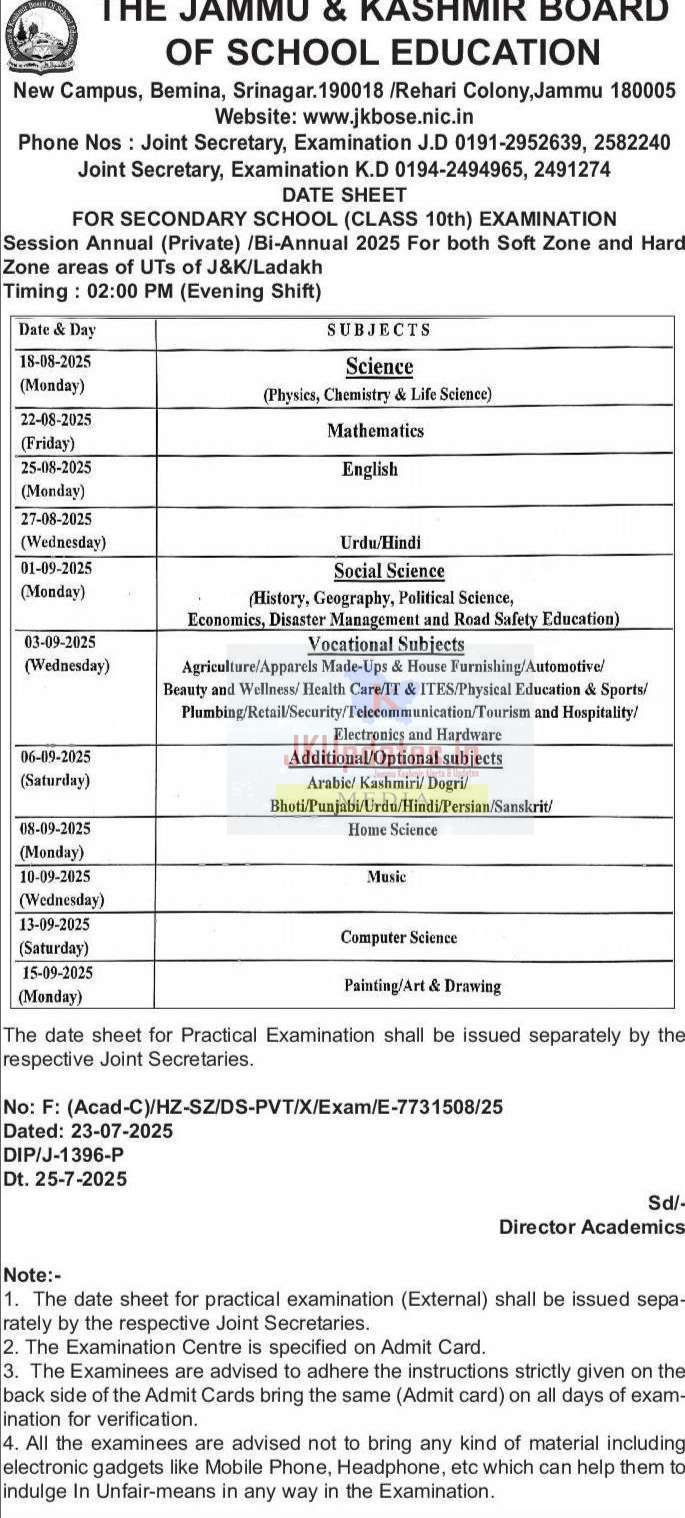 JKBOSE: (CLASS 10th) Bi-annual 2025 Datesheet Released