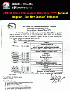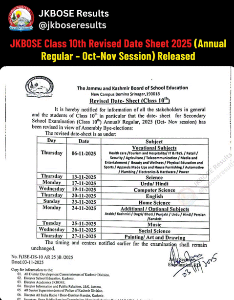 It is hereby notified for information of all the stakeholders in general and the students of Class 10th in particular that the date-sheet for Secondary School Examination (Class 10th) Annual/Regular, 2025 (Oct–Nov session) has been revised in view of Assembly Bye-elections: