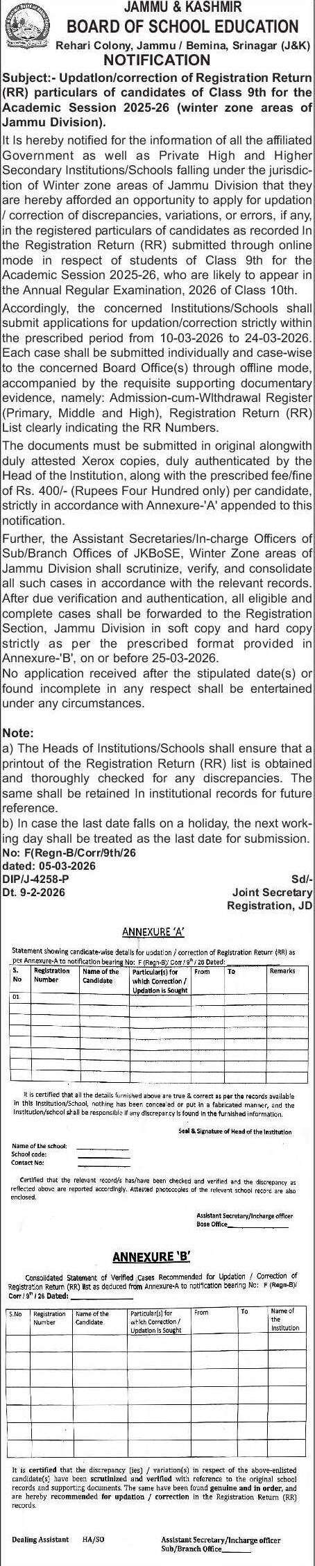 It Is hereby notified for the information of all the affiliated Government as well as Private High and Higher Secondary Institutions/Schools falling under the jurisdiction of Winter zone areas of Jammu Division that they are hereby afforded an opportunity to apply for updation / correction of discrepancies, variations, or errors, if any, in the registered particulars of candidates as recorded In the Registration Return (RR) submitted through online mode in respect of students of Class 9th for the Academic Session 2025-26, who are likely to appear in the Annual Regular Examination, 2026 of Class 10th.