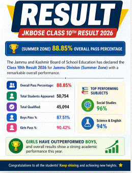 The Jammu and Kashmir Board of School Education (JKBOSE) has officially announced the Class 10 (Secondary School Examination) Result 2026 for the Annual Regular Examination (February–March session) conducted in the Jammu Summer Zone.