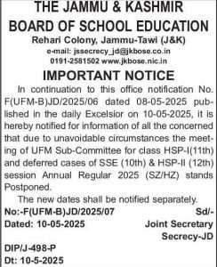 In continuation to this office notification No. F, (UFM-B)JD/2025/06 dated 08-05-2025 published in the daily Excelsior on 10-05-2025, it is hereby notified for information of all the concerned that due to unavoidable circumstances the meeting of UFM Sub-Committee for class HSP-I(11th) and deferred cases of SSE (10th) & HSP-II (12th) session Annual Regular 2025 (SZ/HZ) stands Postponed.