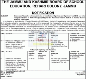 In continuation to Notification No:F(Ext-Mig/Elig-Online)B/2025 Dated:- 10-09-2025 issued by the Joint Secretary Registration, JD, it is hereby notified for information and follow-up of all the concerned, that the dates for submission of online forms for inter-school Migration (within the District, District to District, Division to Division) in respect of Classes 10th and 12th and Eligibility cum Registration (Migration from CBSE and other recognized Boards to J&K Board of School Education) for Jammu Division, including District Leh for the Academic session 2025-26 in Regular capacity for Classes 10th, 11th and 12th shall be allowed to do so for which the process of Online facility shall be available through BOSE website www.jkbose.nic.in as per the below notified schedule: