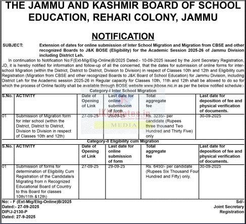 In continuation to Notification No:F(Ext-Mig/Elig-Online)B/2025 Dated:- 10-09-2025 issued by the Joint Secretary Registration, JD, it is hereby notified for information and follow-up of all the concerned, that the dates for submission of online forms for inter-school Migration (within the District, District to District, Division to Division) in respect of Classes 10th and 12th and Eligibility cum Registration (Migration from CBSE and other recognized Boards to J&K Board of School Education) for Jammu Division, including District Leh for the Academic session 2025-26 in Regular capacity for Classes 10th, 11th and 12th shall be allowed to do so for which the process of Online facility shall be available through BOSE website www.jkbose.nic.in as per the below notified schedule: