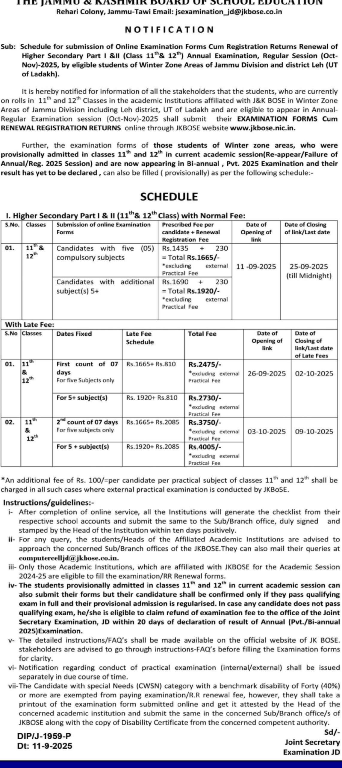 It is hereby notified for information of all the stakeholders that the students, who are currently on rolls in 11th and 12th Classes in the academic institutions affiliated with J&K BOSE in Winter Zone Areas of Jammu Division including Leh district, UT of Ladakh and are eligible to appear in Annual–Regular Examination session (Oct–Nov) 2025 shall submit their Examination Forms Cum Renewal Registration Returns online through JKBOSE website www.jkbose.nic.in.