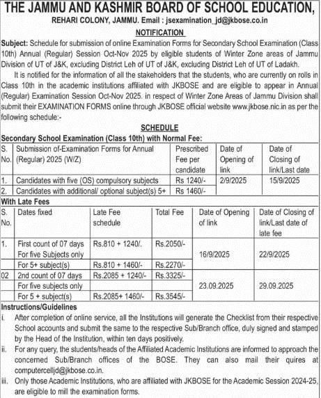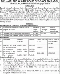 It is notified for the information of all the stakeholders that the students, who are currently on rolls in Class 10th in the academic institutions affiliated with JKBOSE and are eligible to appear in Annual (Regular) Examination Session Oct-Nov 2025, in respect of Winter Zone areas of Jammu Division shall submit their EXAMINATION FORMS online through JKBOSE official website www.jkbose.nic.in