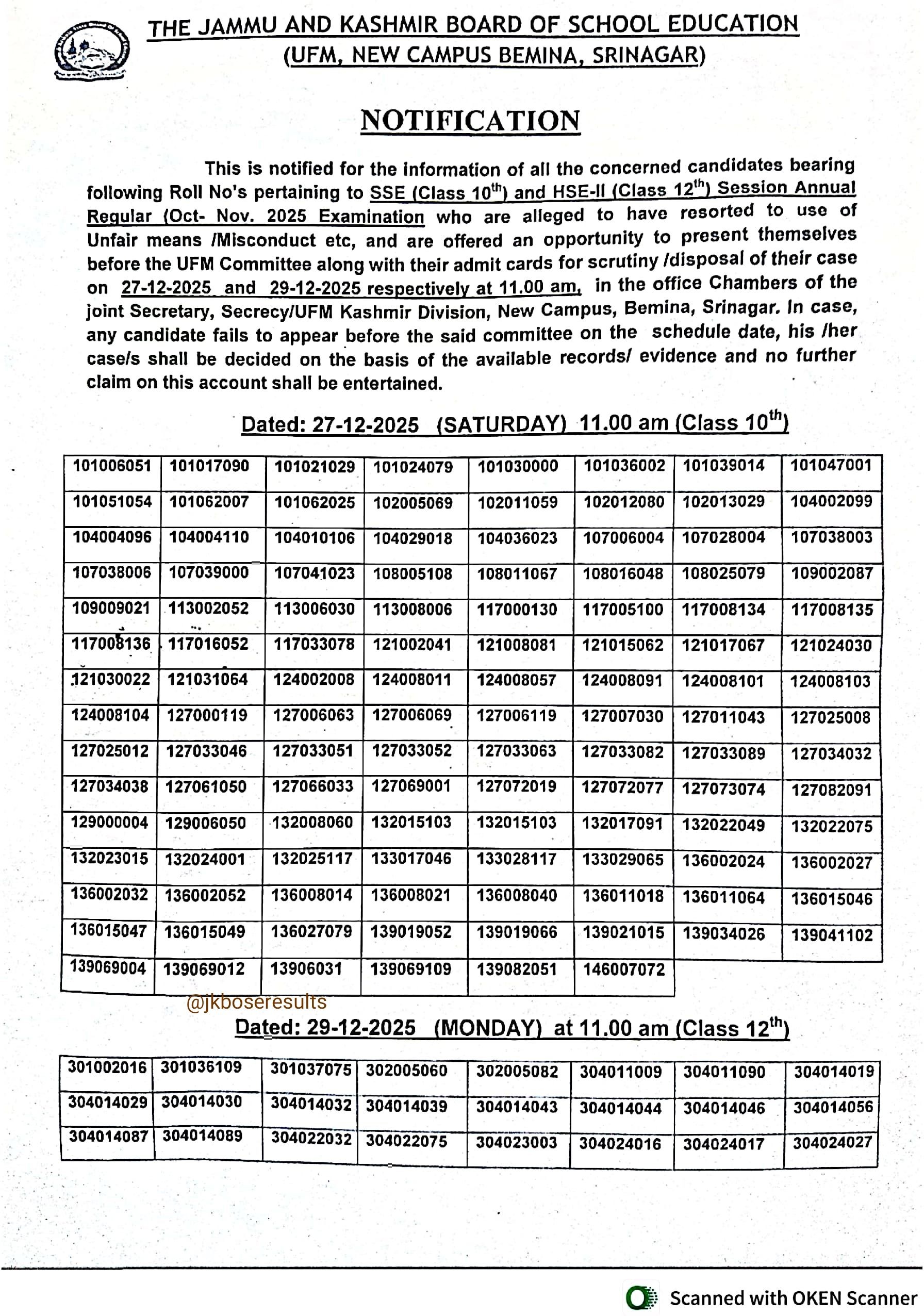 The notice has been issued by the Joint Secretary, Secrecy/UFM, Kashmir Division, and is dated 27 December 2025. Concerned candidates have been provided an opportunity to appear before the Unfair Means (UFM) Committee for scrutiny and disposal of their cases.