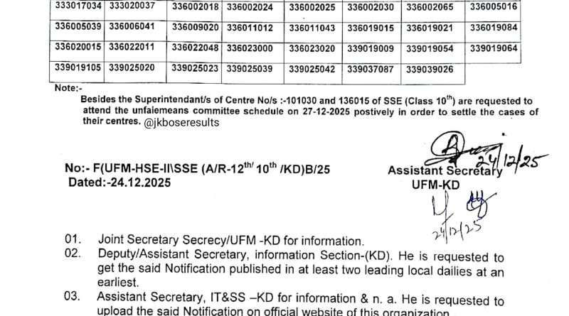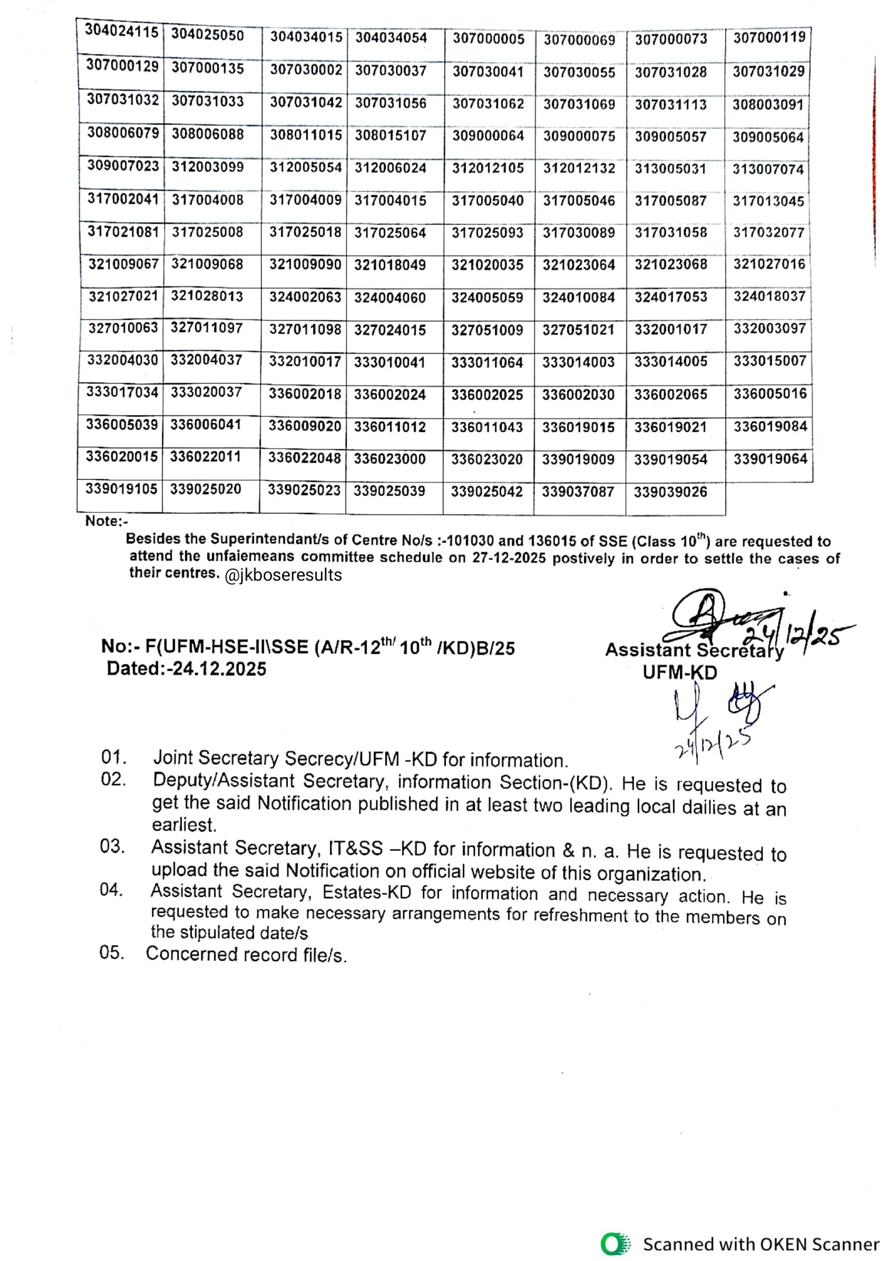The Jammu and Kashmir Board of School Education (JKBOSE) has directed the Centre Superintendents of Centre Numbers 101030 and 136015 (Class 10th) to appear before the UFM Committee on 27 December 2025 to assist in resolving cases related to their centres.