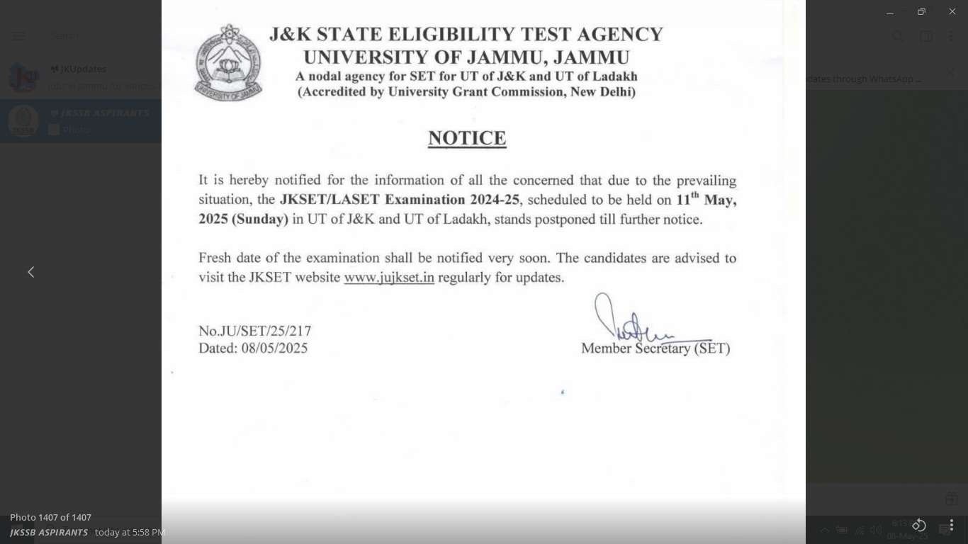 It is hereby notified for the information of all the concerned that due to the prevailing situation, the JKSET/LASET Examination 2024-25, scheduled to be held on 11th May, 2025 (Sunday) in UT of J&K and UT of Ladakh, stands postponed till further notice.